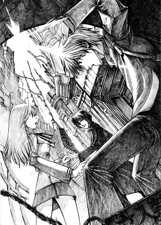 ■電撃イラスト大賞用に描いた物ですね。はっきり言って古いのでヘボイです、、、。 ずっとアップするのを忘れていたので今更ですが、、 カラーのでっかい戦艦と戦ってる男女のイラストと対応してたりします。 謎の地下世界で武器ゲットという感じで。 書き込みのバランスを色々調整しようと苦労がみえますな、、、。 画材:丸ペン、製図用インク